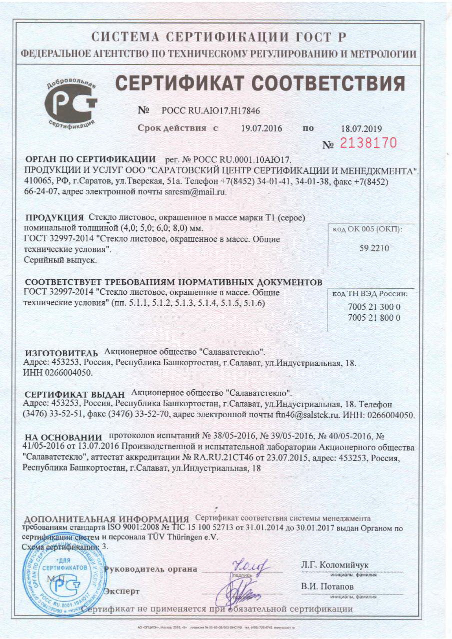 Стекло листовое, окрашенное Т1. РОСС RU.АЮ17.H17846